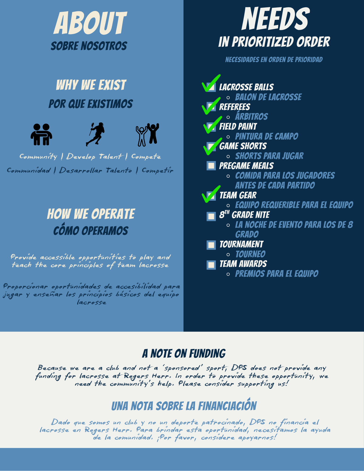 Warbrids apoya el lacrosse juvenil en Durham y proporciona esta plataforma para recaudar donaciones para Rogers-Herr Lacrosse. Todos los fondos presentados a través del botón de donación anterior irán directamente al Rogers-Herr Lacrosse.
